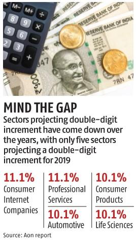Sectors projecting double-digit increment have come down over the years, with only five sectors projecting a double-digit increment for 2019. These include sectors such as Consumer Internet Companies (11.1 per cent), Professional Services (11.1 per cent), Life Sciences (10.1 per cent), Automotive (10.1 per cent), and Consumer Products (10.1 per cent).